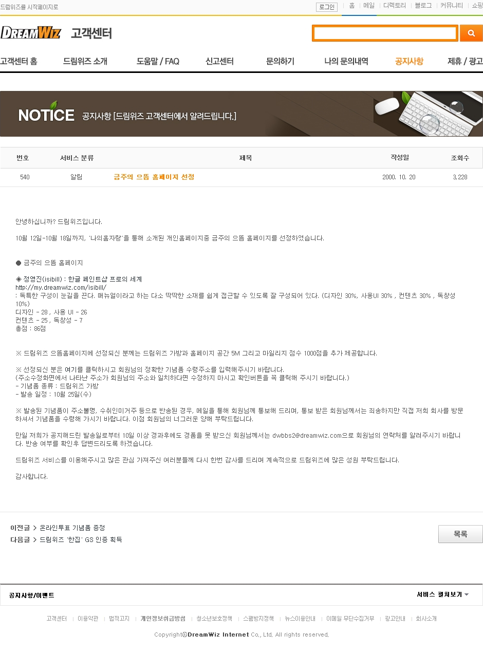 당시 드림위즈에서는 개인 홈페이지 운영자들을 대상으로 "으뜸 홈페이지"라는 제도를 운영하였으며, 잘 만들어진 홈페이지를 선정해 소개하는 방식이었습니다. 이 제도를 통해 창의적이고 개성 있는 홈페이지가 주목받을 기회를 얻었으며, 많은 사람들이 정성껏 자신의 홈페이지를 꾸미고 운영하던 시기였습니다.