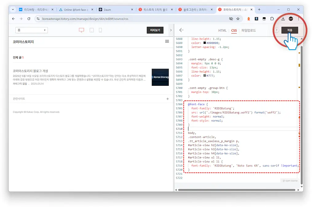 티스토리 블로그 html 편집에서 CSS탭을 선택한 다음 CSS코드 맨 아래에 방금 복사한 코드를 붙여 넣기 한 다음 적용을 클릭합니다.