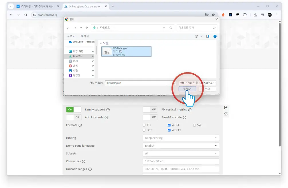 2번에서 저장한 폰트파일을 클릭하여 선택한 후 열기를 클릭합니다.