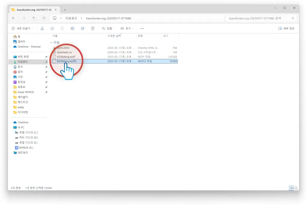 RIDIBatang.woff2 폰트 파일이 업로드되었으면 이것을 클릭하여 선택한 다음 마우스 오른쪽 단추 누른 후 링크 주소 복사를 클릭합니다.