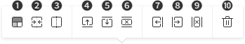 ❶ 표 테마 ❷ 셀 합치기 ❸ 셀 나누기 | ❹ 이전에 행 삽입 ❺ 다음에 행 삽입 ❻ 행 지우기 | ❼ 이전에 열 삽입 ❽ 다음에 열 삽입 ❾ 열 지우기 | ❿ 테이블 삭제