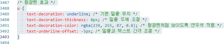 text-decoration-color: rgba(239, 255, 87, 0.8); /* 형광펜처럼 보이도록 연두색 적용+불투명도80% */