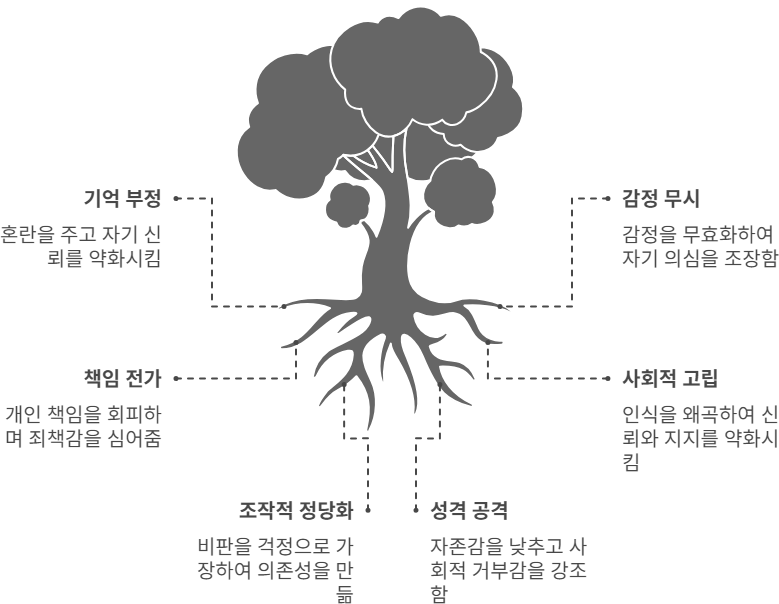 여기에는 두 가지 조작 전략이 숨어 있습니다. 하나는 피해자의 내면적 특성을 부정적으로 낙인찍는 것이고, 다른 하나는 사회적 관계에서의 부정적 평가를 끌어와 위협하는 것입니다. 이 말을 들은 사람은 '나는 원래부터 문제 있는 사람인가?', '내가 바뀌지 않으면 아무도 나를 좋아하지 않겠구나'라는 식으로 자신을 부정하고 고립되기 쉬운 심리상태에 빠지게 됩니다.