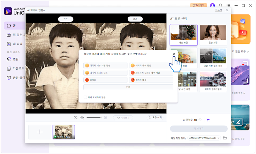 AI 이미지 인핸서에서 제공하는 미리 보기 기능은 크레딧이 차감되지 않는다는 점이 큰 장점입니다. 이를 활용하면, 먼저 원하는 이미지의 품질이 어느 정도 향상되는지 확인한 후, 만족스러운 결과가 나왔을 때만 최종 내보내기(export)를 진행할 수 있습니다.
