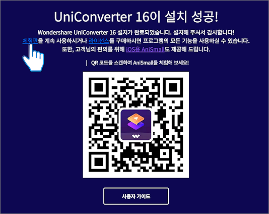 | ✔ 설치 성공 화면이 나타납니다. 파란 글씨의 "체험판"을 클릭합니다. |