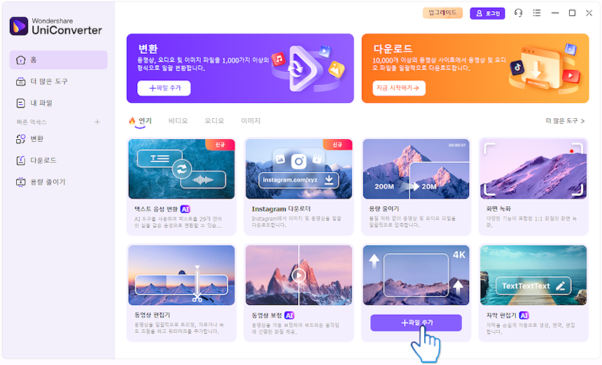 | ✔ 프로그램이 실행되면 "이미지 보정"에 마우스를 올려 "+파일 추가" 버튼을 클릭합니다. |