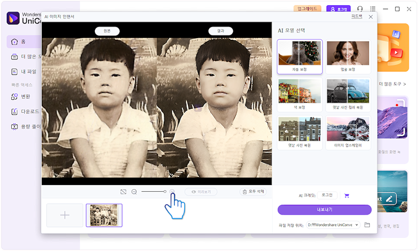 지금까지 Uniconverter의 AI 이미지 인핸서를 이용하여 옛날 사진 복원하는 과정에 대하여 알아보았습니다. 사진이 완전히 훼손된 상태에서는 복원 결과가 그다지 좋지 않으니 포토샵 같은 이미지 보정프로그램에서 어느 정도 보정을 거친 후 Uniconverter AI 이미지 인핸서를 사용하면 매우 좋은 결과물을 얻을 수 있습니다.
