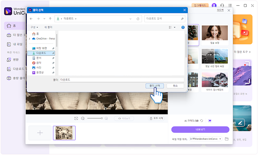 | ✔ 보정결과가 마음에 들면 파일 저장 위치를 클릭하여 "폴더 선택"을 클릭한 다음 "내보내기" 버튼을 클릭합니다. 그러면 로그인 옵션창이 나타납니다. 구글로 로그인을 선택한 후 계속 진행합니다. |