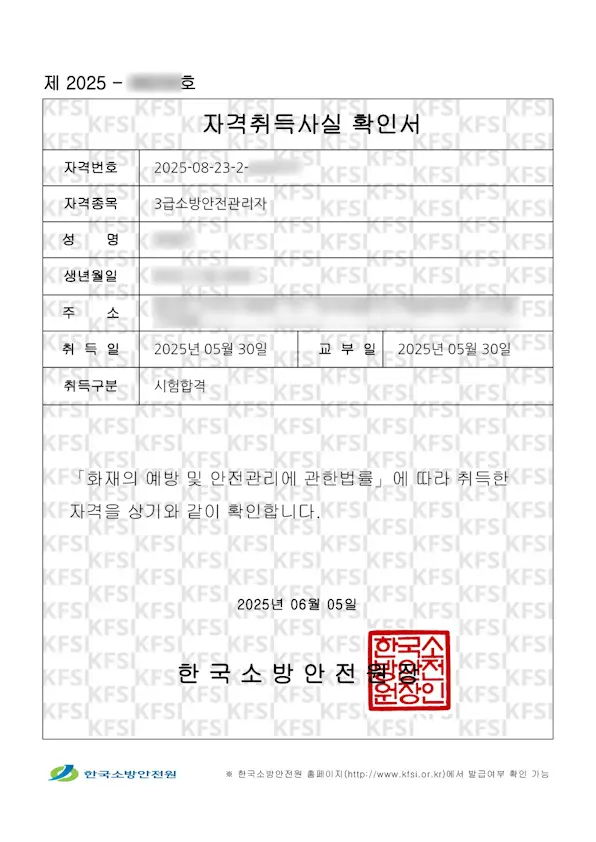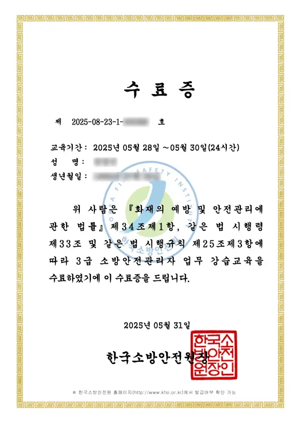 한국소방안전원에서 진행한 소방안전관리자 3급 강습교육과 자격증 취득 과정을 생생하게 기록한 후기입니다. 학점 인정이 가능해 선택하게 된 자격증 취득 동기부터 수원 교육장 방문, 대중교통 이용 팁, 강의와 시험 준비, 최종 합격 후 자격 수첩 수령까지 34일간의 모든 경험을 솔직하게 담았습니다. 주차 요령까지 확인해 보세요. ▼