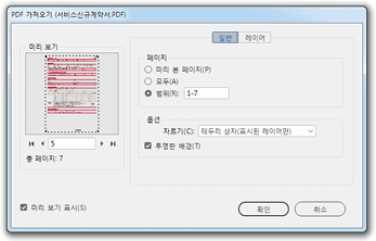 아래의 그림처럼 [해당 파일의 가져오기] 대화 상자가 나타납니다. 여기에서 페이지를 한 장만 가져올 것 인지 전부 또는 범위로 가져올 것인 지를 [선택]할 수 있습니다.