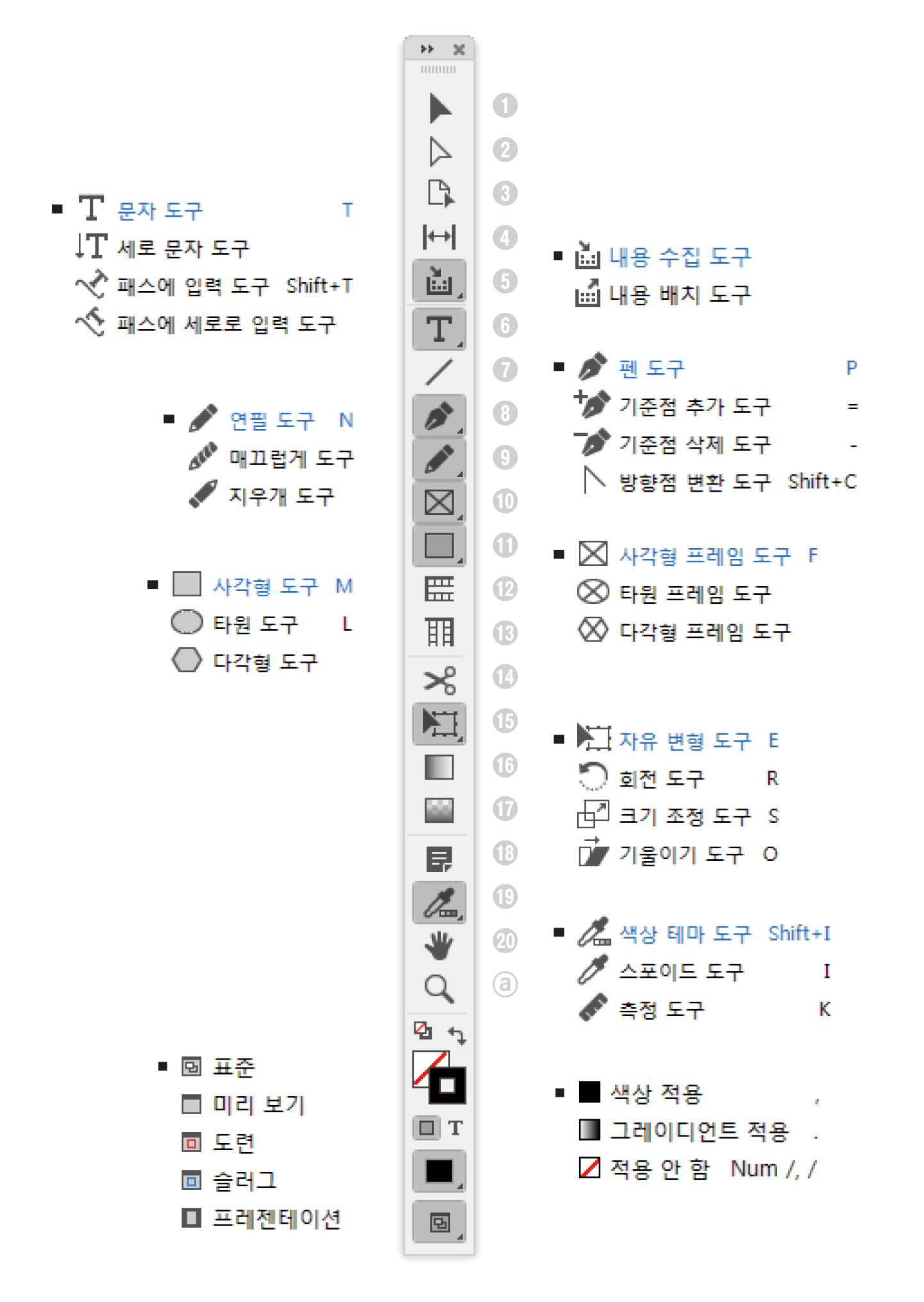 인디자인에서 이미지, 아트웍, 페이지 요소 등을 만들고 편집할 수 있는 도구를 모아 놓은 패널로서 사용 빈도가 가장 높고 중요한 패널입니다.