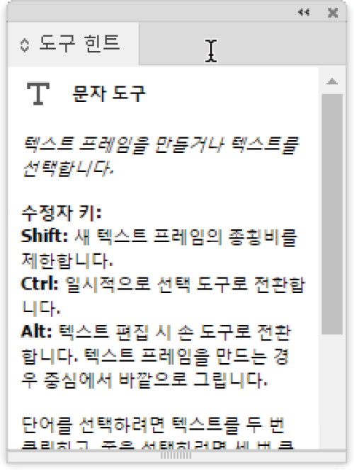 이 도움말은 도구 힌트의 내용과 동일합니다. 도구 힌트를 보려면 [창] > [유틸리티] > [도구 힌트]를 실행합니다. 도구 힌트에는 선택한 도구의 단축키 및 수정자 키를 볼 수 있습니다.