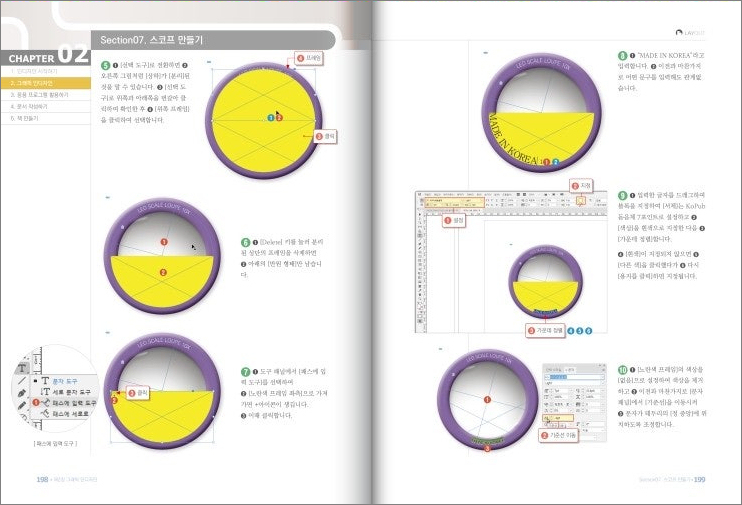 아래의 그림과 같이 설명란의 검은색 둥근 번호와 그래픽의 붉은색 둥근 실행 번호가 정확하게 일치하여 설명이 난해하거나 이해가 부족할 때 예제 이미지의 번호와 비교하면서 직관적으로 학습할 수 있도록 설명 전체를 번호 화하였습니다.
