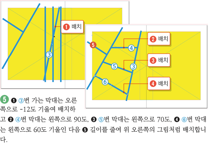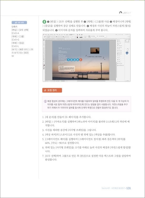 예제 따라잡기 실행 순서를 한 번이라도 놓치는 실수가 없도록 세심하게 번호 순서를 정하여, 인디자인 완전 초보자조차 쉽게 따라 할 수 있는 실행 번호가 명기되어 있습니다. 무조건 번호를 따라 하면 예제가 완성되는 구조입니다.