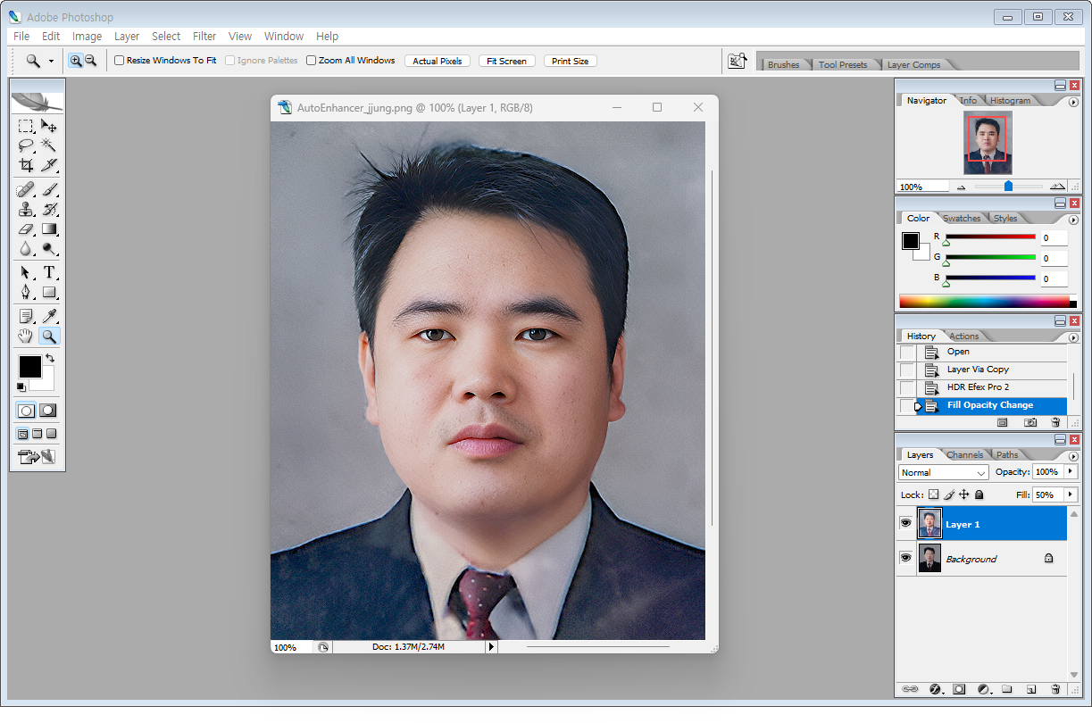 스캔한 증명사진을 유니컨버터의 AI 이미지 인핸서에서 자동 보정 한 다음 포토샵을 실행, 레이어를 복제하여 닉컬렉션 HDR Efex Pro2 필터를 적용하였고 레이어의 불투명도를 조절하는 방법으로 보정하였습니다.