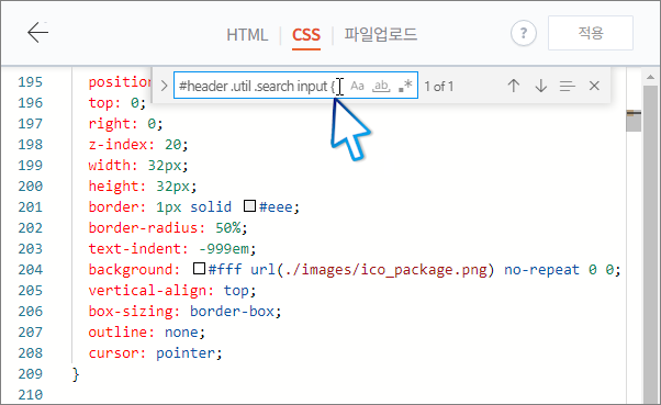 ❷ 편집창 내부를 아무데나 한번 클릭한 다음 Ctrl + F키를 눌러 방금 복사한 코드를 검색창에 붙여 넣기 합니다.