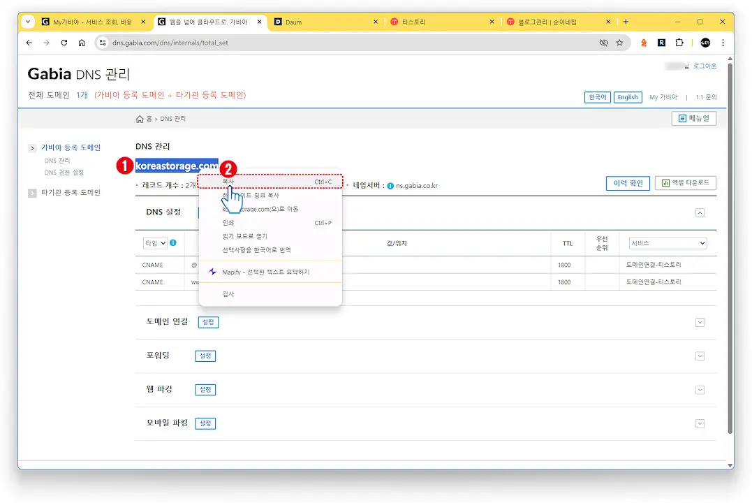 가비아 DNS 관리에서 도메인 주소를 ❶드레그 하여 선택한 후 마우스 오른쪽 단추 눌러 ❷복사를 클릭합니다.