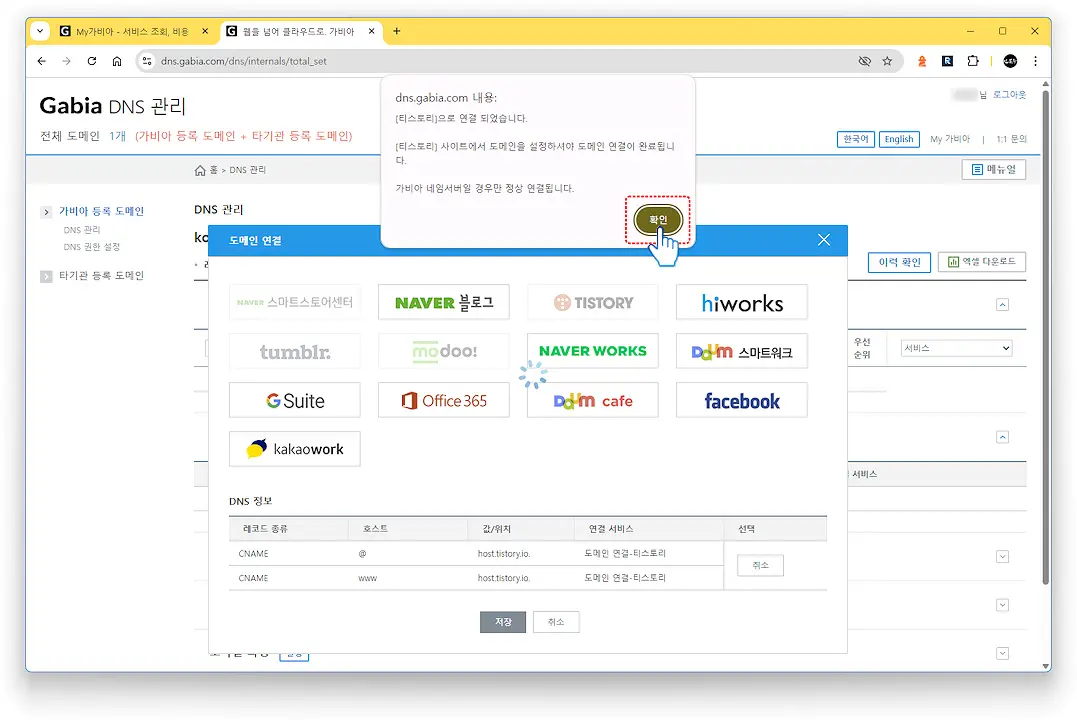 도메인이 티스토리로 연결되었다는 안내창이 나타납니다. 확인을 클릭합니다.