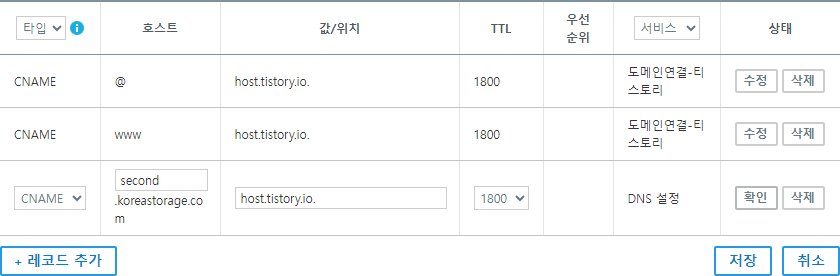 타입은 CNAME, 호스트는 second, 값/위치는 host.tistory.io., TTL은 1800으로 지정한 다음 확인을 클릭합니다.