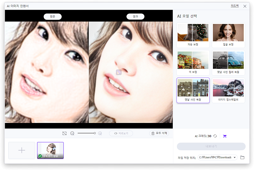 Uniconverter의 옛날 사진 복원 AI 기능을 적용하는 과정에서, 컬러 스케치가 엄청난 퀄리티로 보정되는 것을 보고 깜짝 놀랐습니다. 원본에서는 희미하고 흐릿했던 이미지가 복원된 결과물에서는 선명하고 깨끗하게 변하는 모습을 보며, 지난번에 "이미지 보정의 끝판왕"이라고 소개했던 Uniconverter의 성능이 결코 과장이 아니었음을 다시 한번 실감했습니다. AI 기술이 적용된 복원 결과를 직접 확인하면서, 오래된 저화질 이미지도 마치 새롭게 촬영한 사진처럼 되살아날 수 있다는 점이 매우 인상적이었습니다.