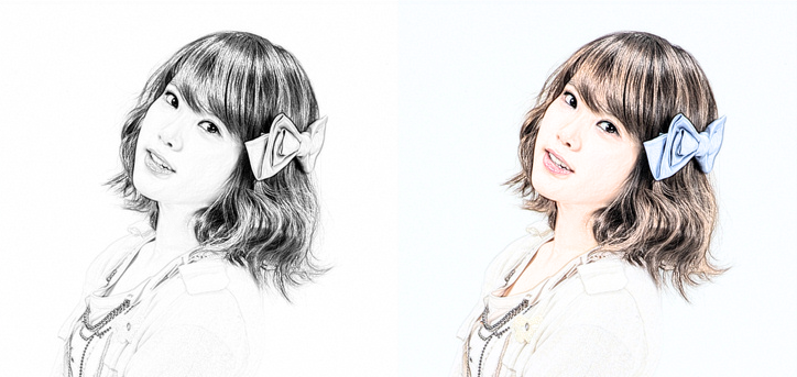 아래 오른쪽에 보이는 이미지는 13년 전에 만든 컬러 스케치 작품입니다. 원본 이미지에서 선을 추출하면 왼쪽 이미지처럼 흑백 스케치가 만들어지며, 이 흑백 스케치와 사진 원본을 블렌딩(blending)하면 최종적으로 오른쪽과 같은 컬러 스케치가 완성됩니다. 다만, 이미지의 해상도가 낮아 작은 화면에서는 차이가 크지 않지만, 확대해보면 퀄리티가 많이 떨어지는 것을 확인할 수 있습니다.