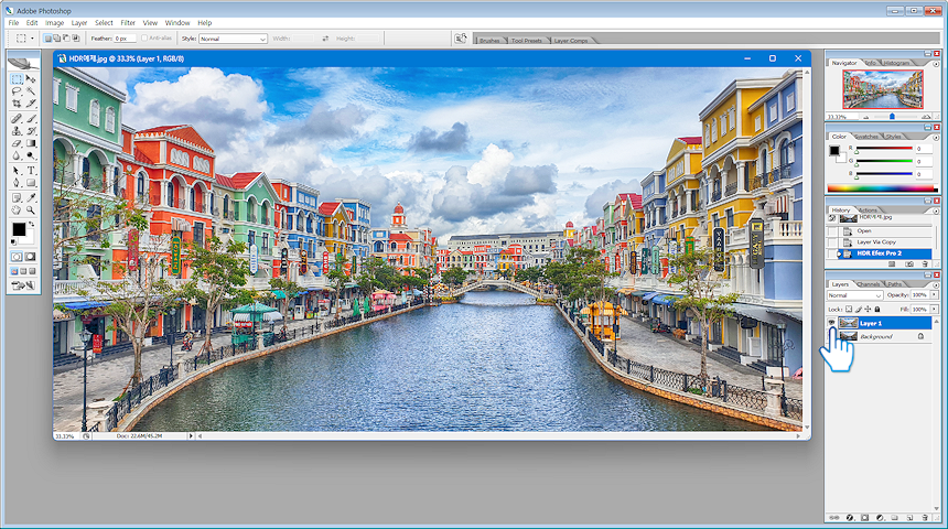 ◾HDR효과 적용이 완료된 모습입니다. Layer1의 보기 토글을 클릭하여 적용 전후의 결과물을 확인합니다.