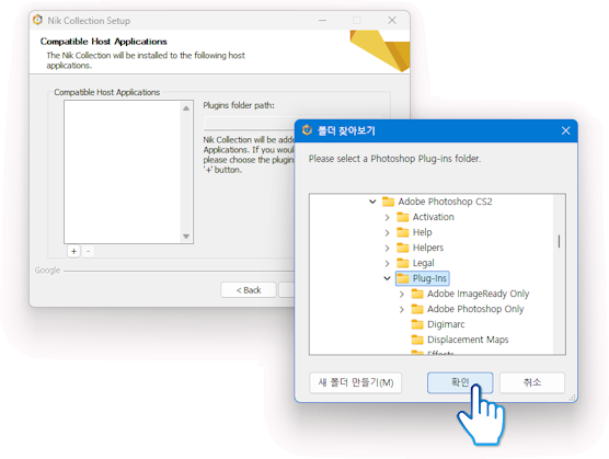 ◾포토샵이 설치되어 있는 경로에서 "Plg-ins" 폴더를 클릭하여 지정한 다음 "확인"을 클릭합니다.